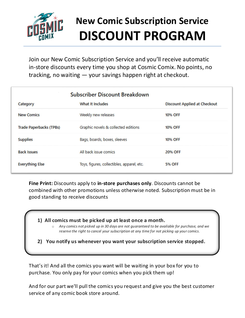 You’ll also receive automatic in-store discounts every time you shop at Cosmic Comix. No points, no tracking, no waiting — your savings happen right at checkout. You only pay for the comics you want (and earn rewards on those comics) when you pick them up.